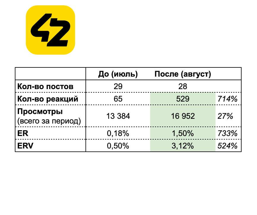 За месяц с помощью измененного контента нам удалось увеличить: • ERV с 0,50% до 3,12% • ER с 0,18% до 1,5% • Просмотры постов с 13,384 до 16,952 за сравниваемые периоды • Кол-во реакций с 65 до 529 за сравниваемые периоды